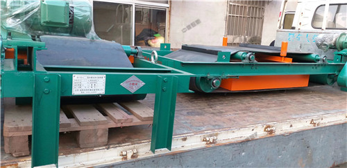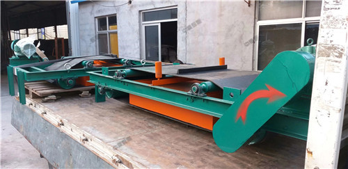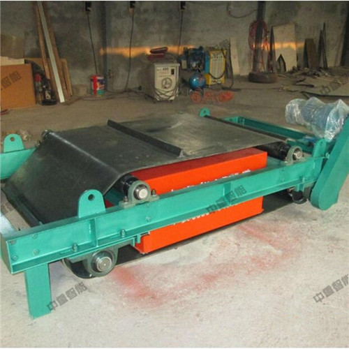當顆粒狀物料經過永磁自卸除鐵器的正下方時,混雜在物料中的鐵磁性雜質大約0.1—0.36公斤被吸起,由于除鐵器上的皮帶不停的運轉,當吸附在上面的鐵磁性物料經過無磁區時,便被皮帶上的鐵件刮出,扔進集鐵箱,從而達到連續自動除鐵的目的。