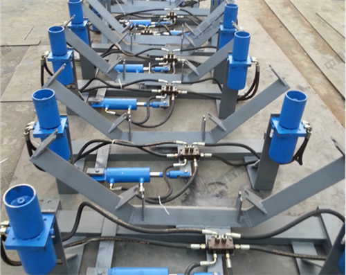 液壓調偏裝置是由檢驅輪、油泵、復合油缸、油管、固定支架構成。當皮帶運行跑偏時,皮帶和檢驅輪接觸,檢驅輪帶動油泵旋轉,輸出液壓油控制驅動油缸往復運動,帶動調心托輥偏轉,使調心托輥的線運動方向與皮帶的運動方向形成一個夾角,產生的摩擦力驅動皮帶,是皮帶始終在設定的范圍內運行,從而避免皮帶跑偏造散料、皮帶與皮帶機架摩擦撕帶,達到保護皮帶機正常運行的目的。自動液壓調偏裝置的核心部分為:一組液控換向閥,它是由兩個液控換向閥單體組成。每個液控換向閥分別與一套檢驅輪泵組連接,兩個液控換向閥共同控制一條油缸,來完成油缸的伸縮運動,并且每個液控換向閥之間互相影響,對油缸的控制迅速,準確。產品屬性、結構組成在機架上安裝一組調心托輥,在調心托輥的兩側相同高度垂直安裝兩只檢驅輪,檢驅輪轉軸與油泵的動力輸入軸連接,分別把左右兩側的檢驅輪轉軸和油泵固定在機架上,調心托輥與左側固定支架之間設置復合油缸,復合油缸的尾部與固定支架鉸接,復合油缸的活塞桿與調心托輥的托輥架傳動部分左側鉸接,用油管把油泵的油口與復合油缸缸尾部的油口接通。 當皮帶跑偏時,皮帶邊緣觸動檢驅輪,而使油泵迅速輸出液壓油,通過油缸的油路集成塊進入油缸,從而驅動活塞桿迅速的伸出或縮回,拉動調心桿托輥轉動,使皮帶居中。