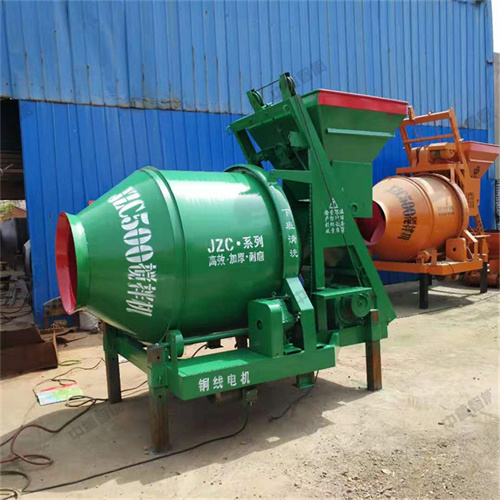 混凝土攪拌機系自落式雙錐反轉出料攪拌機,攪拌筒由齒圈或摩擦傳動,工作時正轉攪拌,反轉出料,可攪拌塑性和半干硬性混凝土,適用于一般建筑工地,道路,橋梁工程及各種混凝土構件廠。具有結構合理,并具有效率高,攪拌質量好,造型美觀,移動方便等優點。包含JZC250,350,500和750四種主要機型和JZM系列,其中JZC750型為固定式,除作為單機使用外,還可與配料機組合成簡易式攪拌站,其余機型均為移動式。攪拌機構由攪拌筒、托輪和傳動系統組成。攪拌筒是攪拌機的工作部件、攪拌筒為雙錐形、筒體內焊有兩對高低片,交叉布置,分別與拌筒軸線成一定夾角,攪拌筒旋轉時,葉片在使物料提升下落的同時,還使物料軸向回竄動,所以攪拌運動比較強烈,攪拌35-45秒即可達到勻質混凝土。在攪拌筒的出料錐體內部,焊有一對出料葉片,改變攪拌筒旋轉方向,混凝土即由底葉片推向出料葉片并排出筒外。攪拌筒由四個托轉支承,攪拌筒由電機經減速箱驅動齒圈而旋轉,故在有霧、陰雨天氣,仍然可靠工作。傳動系統,減速箱為二級賀柱齒輪減速,傳動比為6.04248,三角皮帶輪速比為2.3912,拌筒齒圈速比為7.1111,總傳動比為102.7467。抖筒的正反轉由電機換向實現。供水系統由電機、水泵、調節閥和管路組成。電機通電后水泵即可將水直接注入拌筒,并通過調節閥來調節水的流量,(出廠時流量已調整合適)。攪拌所需的水量,是通過電氣箱內的時間斷電器直接控制水泵電機運轉時間來實現的。用戶可按給定的時間流量關系,選擇要求供水量所需時間,并可定期校核或調整。供水處有二個起動按鈕,供水時,按一下左邊的一只按鈕,水泵啟動,到達規定的時間后,供水電路自動切斷。右邊的旋轉式按鈕旋轉后,按一下左邊的按鈕可連續供水,擰分流裝置螺母,接上水管,可以沖洗攪拌機外表,拆開螺母,即能恢復正常的供水狀態。
