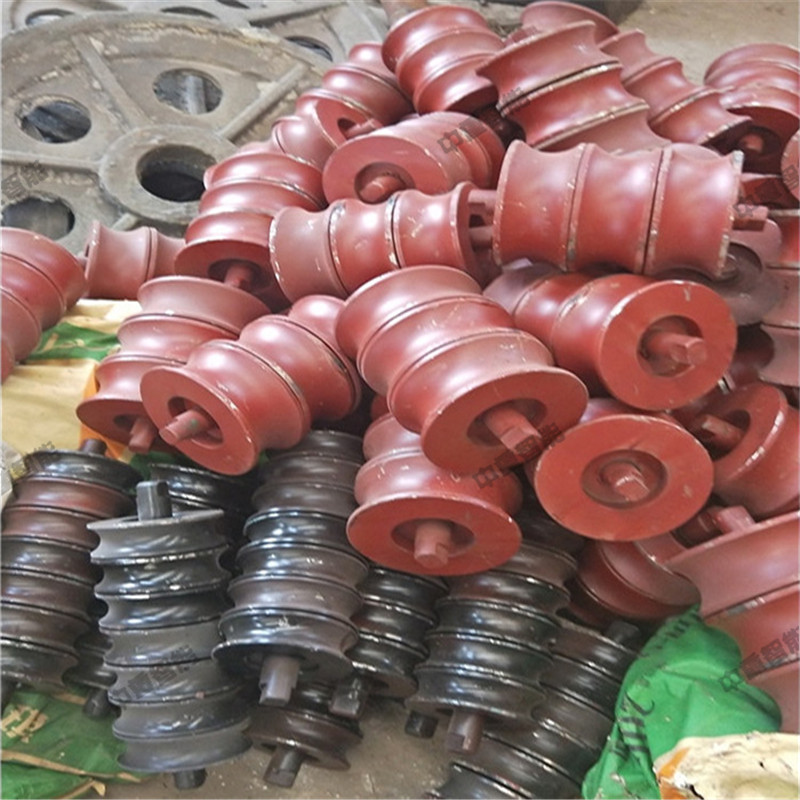 為適應起伏變化的坡道,沿途配置有輪組,既可防止鋼絲繩抬高時車輛掉道,又可避免鋼絲繩摩擦巷道底板,根據其用途分為主壓繩輪組、副壓繩輪組、平托輪組或組合輪組等。