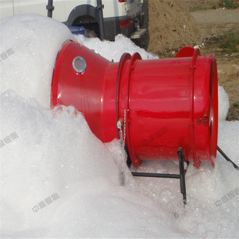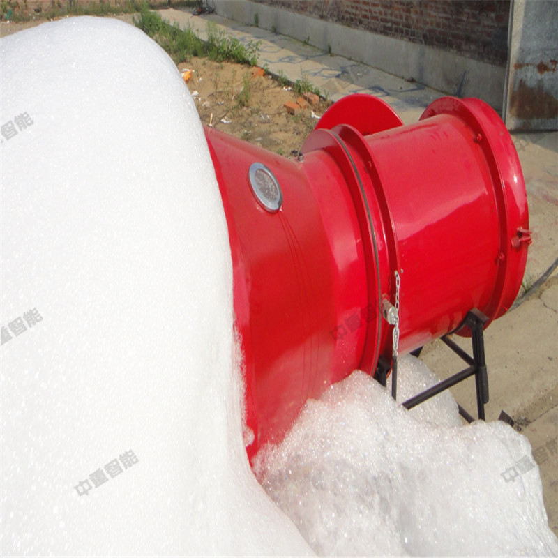 高倍數空氣泡沫具有滅火速度快、水漬損失小、成本低和無毒等優點。實踐說明,高倍數泡沫滅火適用于撲滅煤礦井下巷道及地面,地下有限建筑空間。如煤炭、木材、油類火災。由于驅動風壓高,可以在巷道中遠距離火區的安全地點操作。高倍數泡沫能迅速覆蓋火源,切斷火場空氣的來源,隔斷輻射熱、熱對流、熱傳導的作用。高倍數泡沫在燃燒區汽化而吸收大量的汽化熱。能起隔熱、降溫作用,同時放出大量的水蒸氣,沖淡燃燒區含氧量,起著窒息的作用。