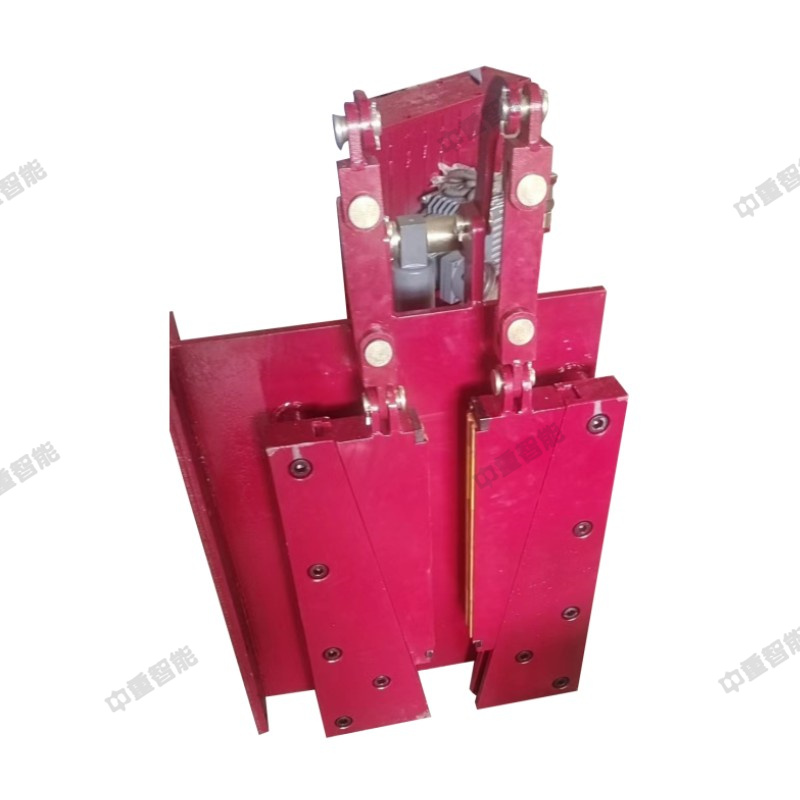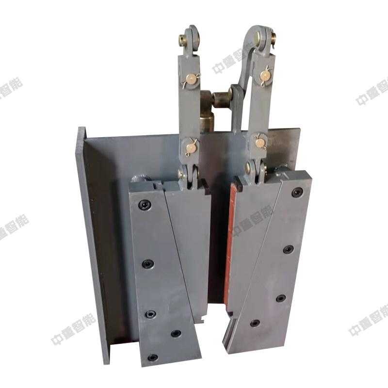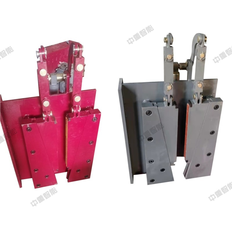 鋼絲繩防逆轉(zhuǎn)制動系統(tǒng)組成如下:檢測輪組、固定裝置、傳感器,組成檢測裝置,固定架將檢測輪組固定在鋼絲繩上,檢測輪組隨鋼絲繩的運行而轉(zhuǎn)動,傳感器可以鑒別檢測輪組的運行狀態(tài),從而判斷系統(tǒng)運行是否正常。設備運行正常時,聲光報警器閃爍綠燈,傳感器判定鋼絲繩逆轉(zhuǎn)時,聲光報警器閃爍紅燈,并發(fā)出“鋼絲繩逆轉(zhuǎn),請緊急處理”的報警語音。阻攔裝置,具有單向通過性,沿線布置,根據(jù)乘人裝置設計參數(shù),布置間距10-20米,確保鋼絲繩逆轉(zhuǎn)時,每個吊椅均會被阻攔裝置攔停,吊椅被阻攔裝置攔停后,卡在設計好的卡槽中,增加了鋼絲繩的制動力。鋼絲繩制動單元包含電液推動器、鋼絲繩制動抓捕器以及中繼控制箱,其中,鋼絲繩制動抓捕器采用楔型結(jié)構(gòu),寬閘口設計,確保架空乘人裝置的抱索器能通過制動抓捕器的閘口。制動時,閘口閉合,楔型塊回收,鋼絲繩在閘口內(nèi)被擠壓、制動,直至鋼絲繩完全被鎖在閘口內(nèi)。