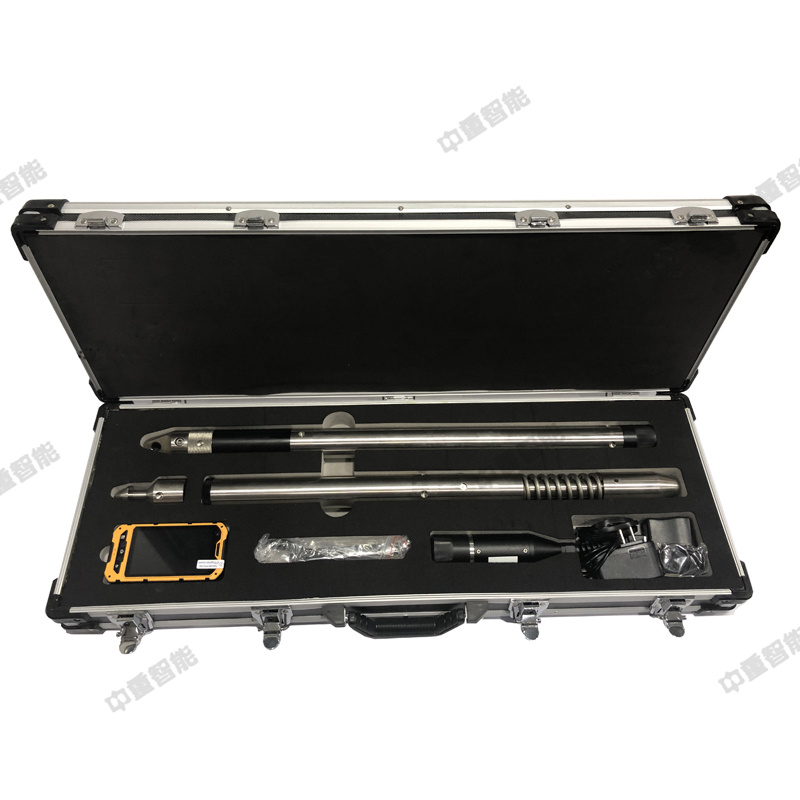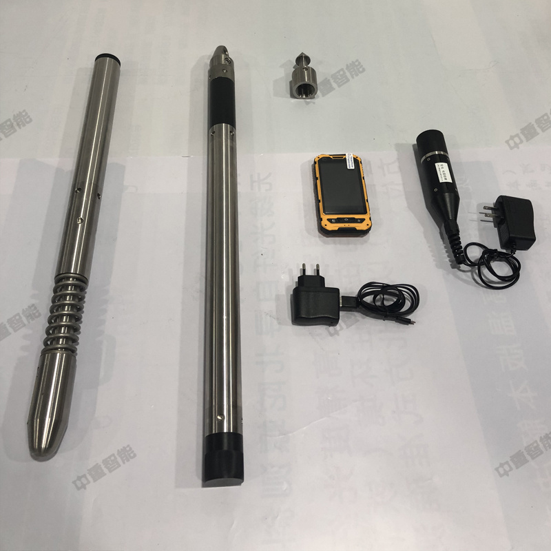 KXP-2X無線數字羅盤測斜儀由兩部分組成:探棒和一個無線控制儀,兩個設備間通過無線方式進行通訊,無需使用線纜。探棒用來測量和采集鉆孔的孔斜和方位數據,無線控制儀用來設置測量參數及查閱測量結果。通過無線控制儀完成測井時間的設置后,探棒根據預設的時間自動采集并保存數據,待測井完成后通過無線控制儀讀取探棒內部的數據,即可在顯示屏上直接讀取測量結果。