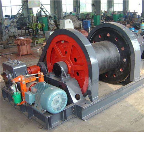 鑿井絞車結構為纏繞式,主要由主軸裝置、減速器、帶制動輪的彈性聯軸器、工作制動器、安全制動器、機座、電動機等部件組成。