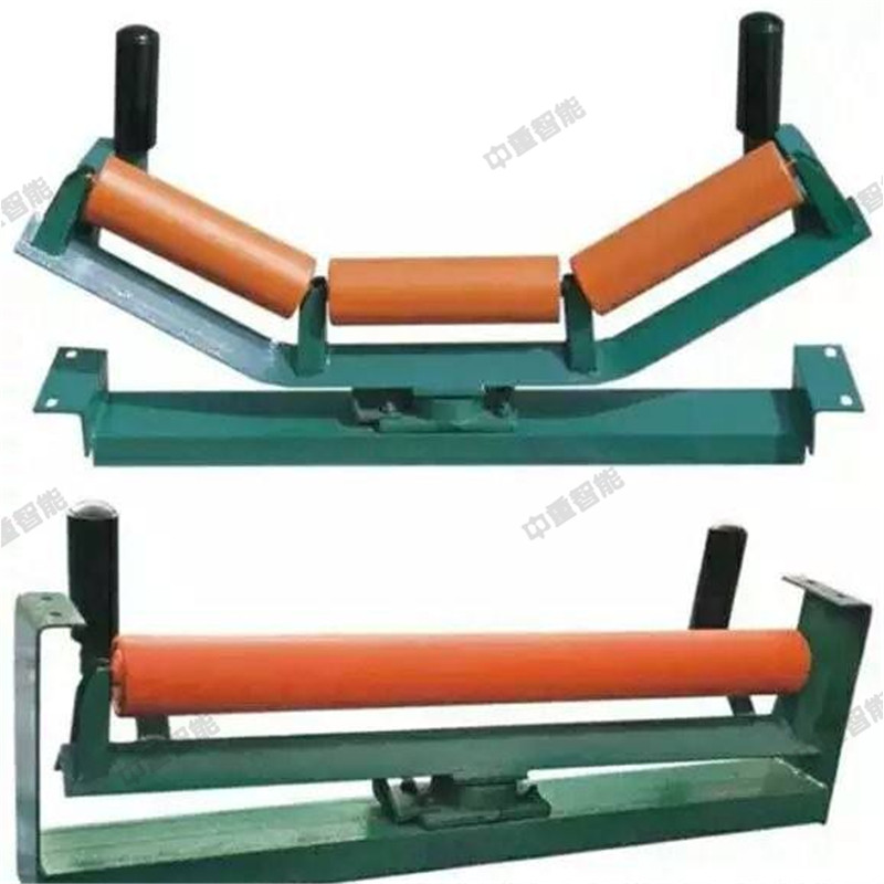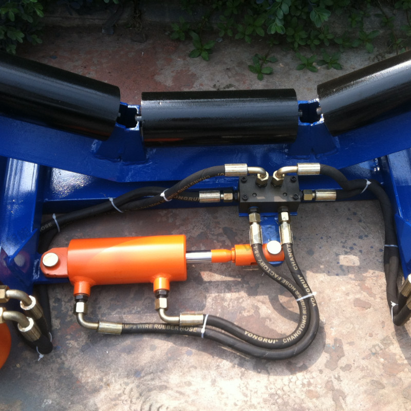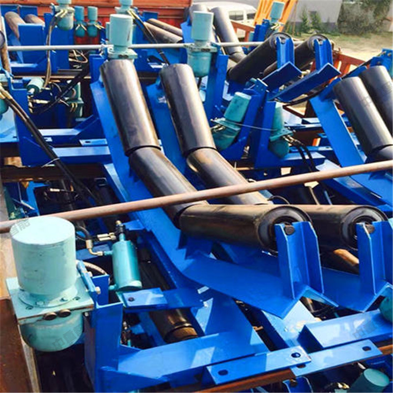 自動液壓調偏裝置是由檢驅輪、油泵、復合油缸、油管、固定支架構成。當皮帶運行跑偏時,皮帶和檢驅輪接觸,檢驅輪帶動油泵旋轉,輸出液壓油控制驅動油缸往復運動,帶動調心托輥偏轉,使調心托輥的線運動方向與皮帶的運動方向形成一個夾角,產生的摩擦力驅動皮帶,是皮帶始終在設定的范圍內運行,從而避免皮帶跑偏造散料、皮帶與皮帶機架摩擦撕帶,達到保護皮帶機正常運行的目的。自動液壓調偏裝置的核心部分為:一組液控換向閥,它是由兩個液控換向閥單體組成。每個液控換向閥分別與一套檢驅輪泵組連接,兩個液控換向閥共同控制一條油缸,來完成油缸的伸縮運動,并且每個液控換向閥之間互相影響,對油缸的控制迅速,準確。產品屬性、結構組成在機架上安裝一組調心托輥,在調心托輥的兩側相同高度垂直安裝兩只檢驅輪,檢驅輪轉軸與油泵的動力輸入軸連接,分別把左右兩側的檢驅輪轉軸和油泵固定在機架上,調心托輥與左側固定支架之間設置復合油缸,復合油缸的尾部與固定支架鉸接,復合油缸的活塞桿與調心托輥的托輥架傳動部分左側鉸接,用油管把油泵的油口與復合油缸缸尾部的油口接通。 當皮帶跑偏時,皮帶邊緣觸動檢驅輪,而使油泵迅速輸出液壓油,通過油缸的油路集成塊進入油缸,從而驅動活塞桿迅速的伸出或縮回,拉動調心桿托輥轉動,使皮帶居中。